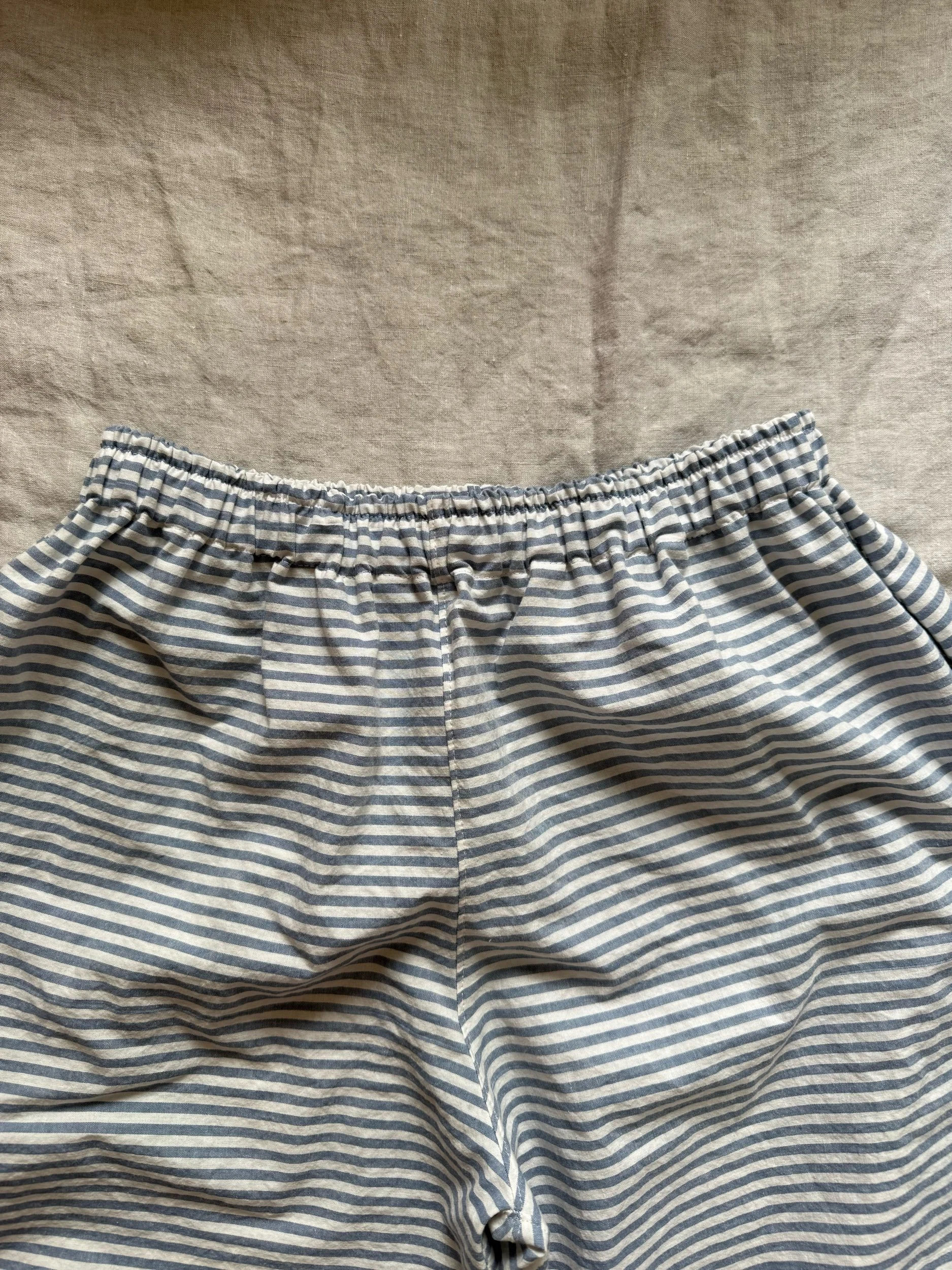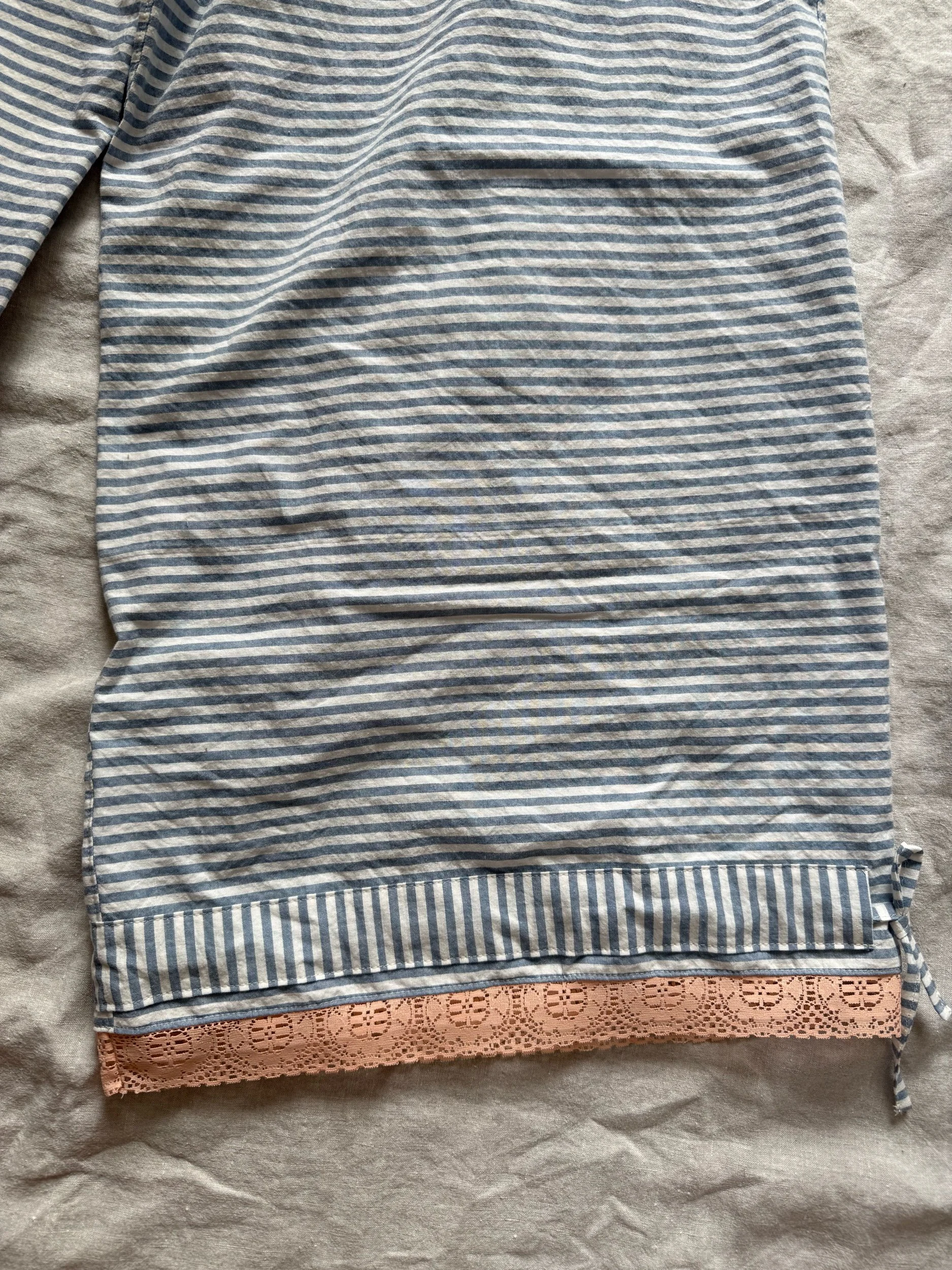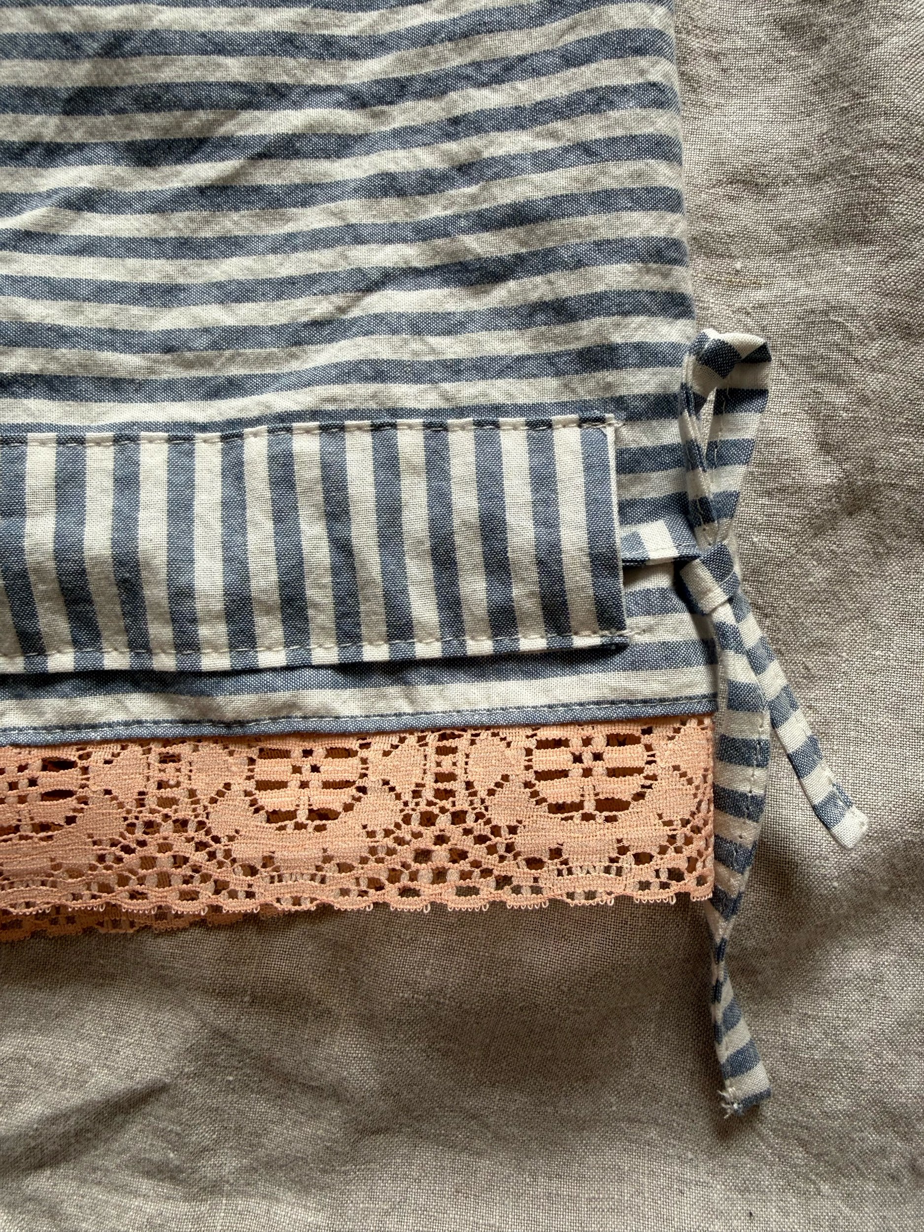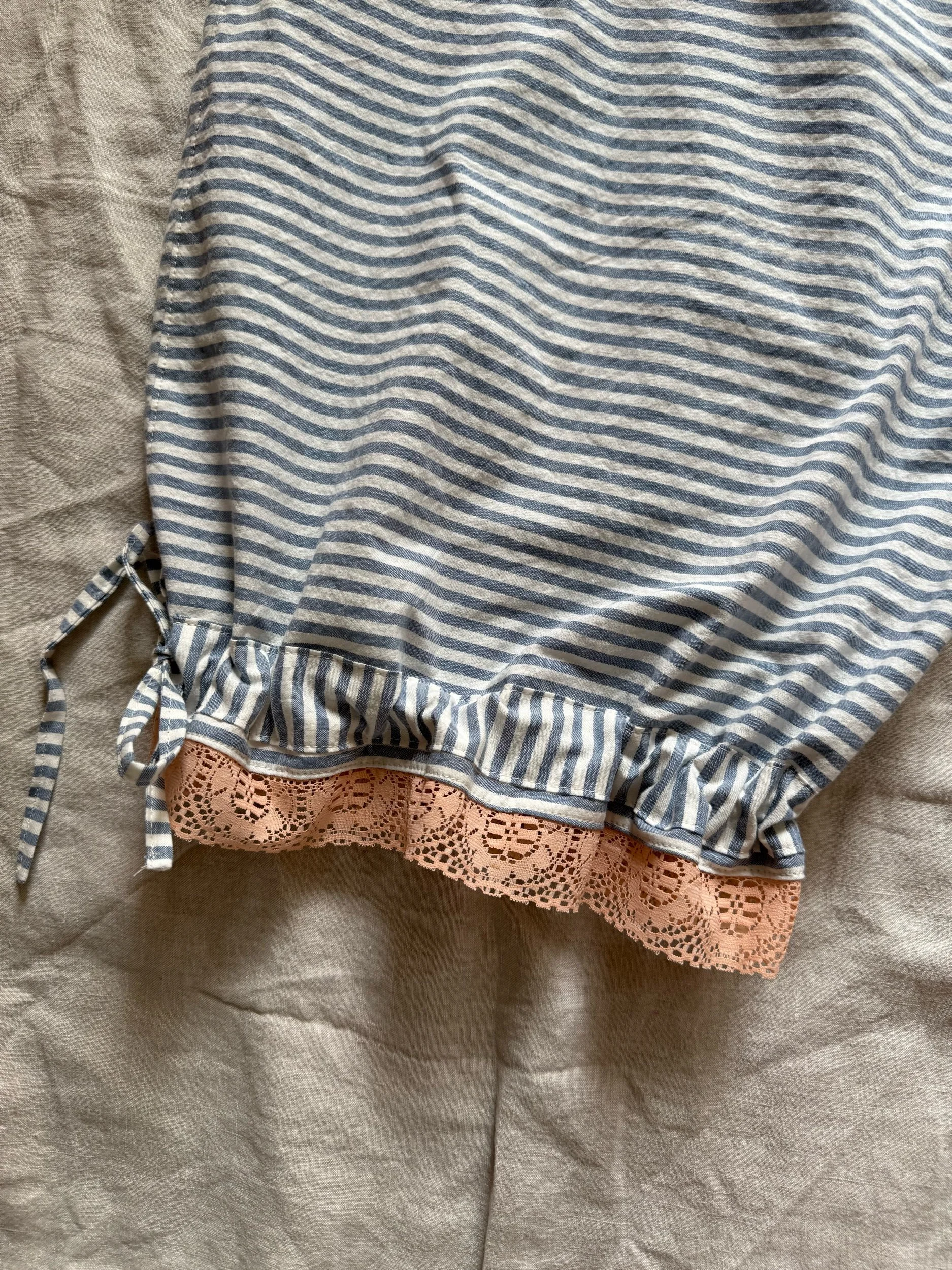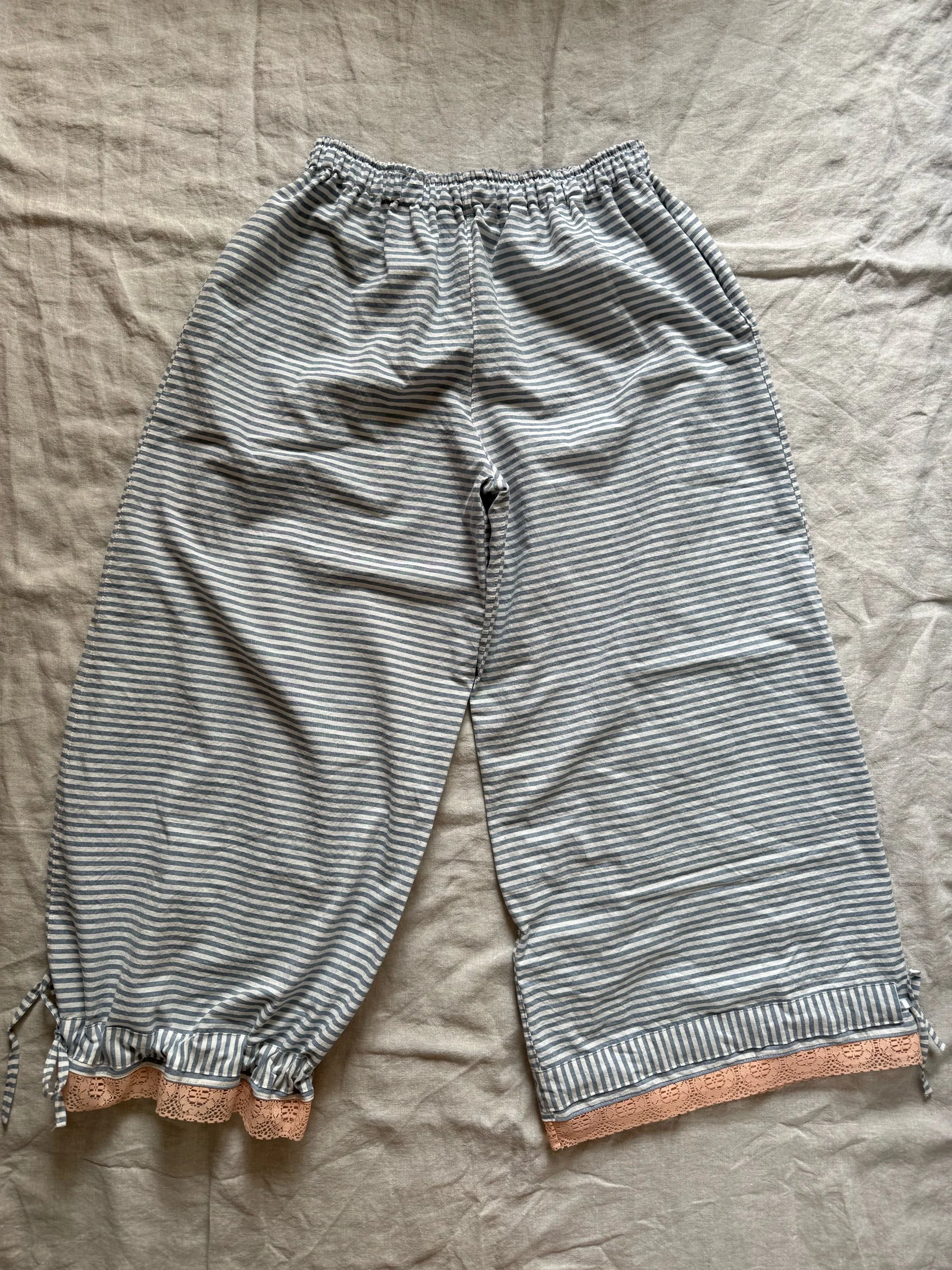 made from white and blue 100% cotton fabric & antique peach lace with pockets and adjustable ankle ties