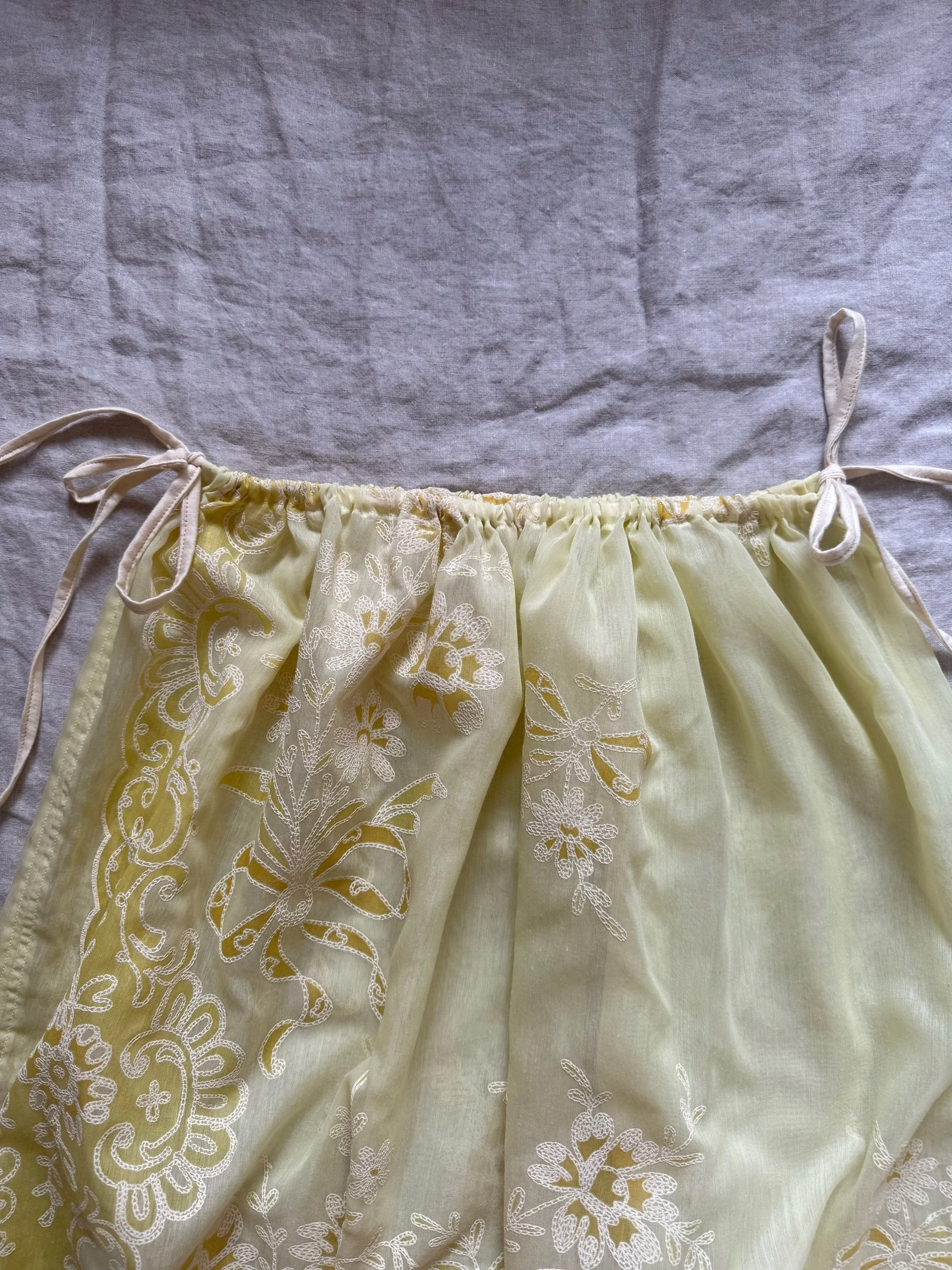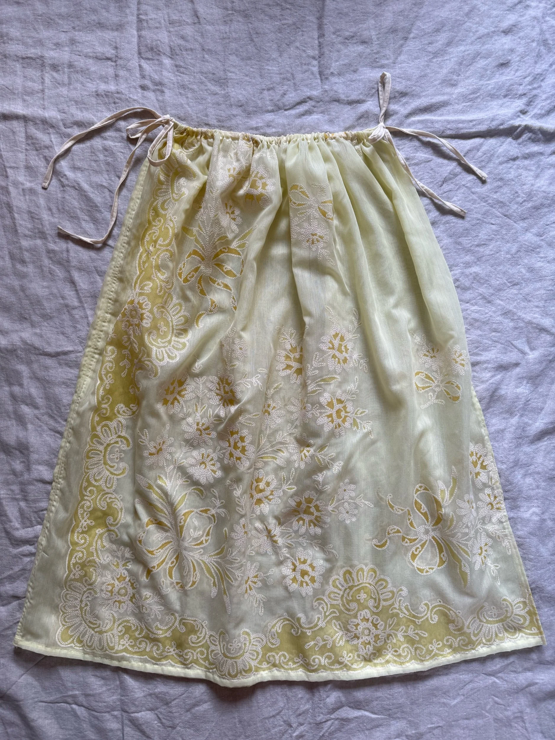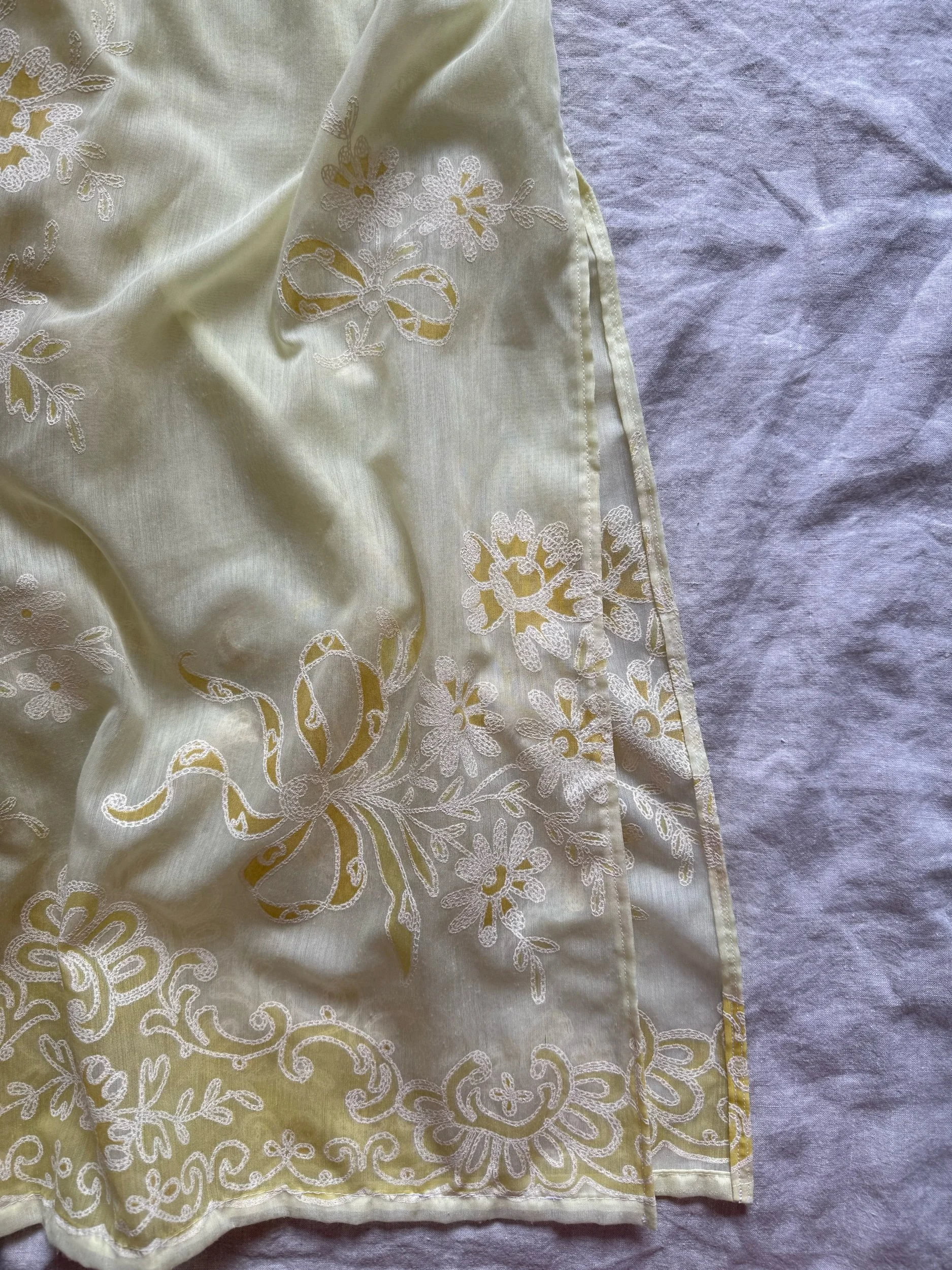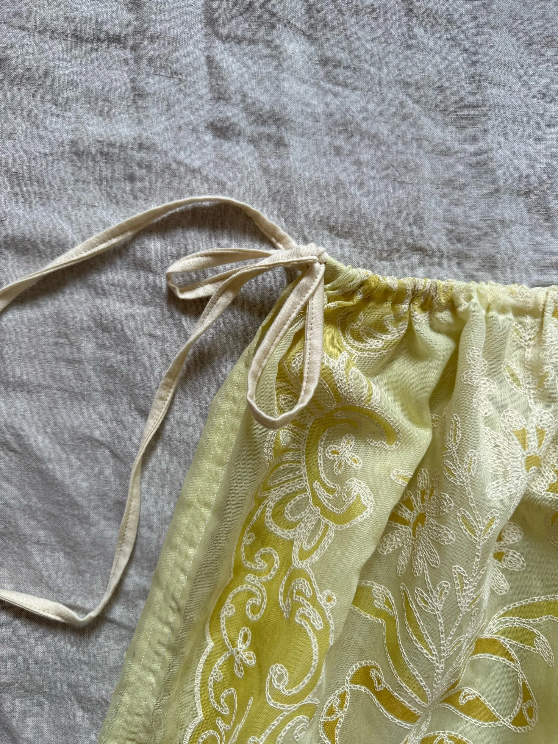 made from see through butter yellow fabric with adjustable tie waist & long slit on one side