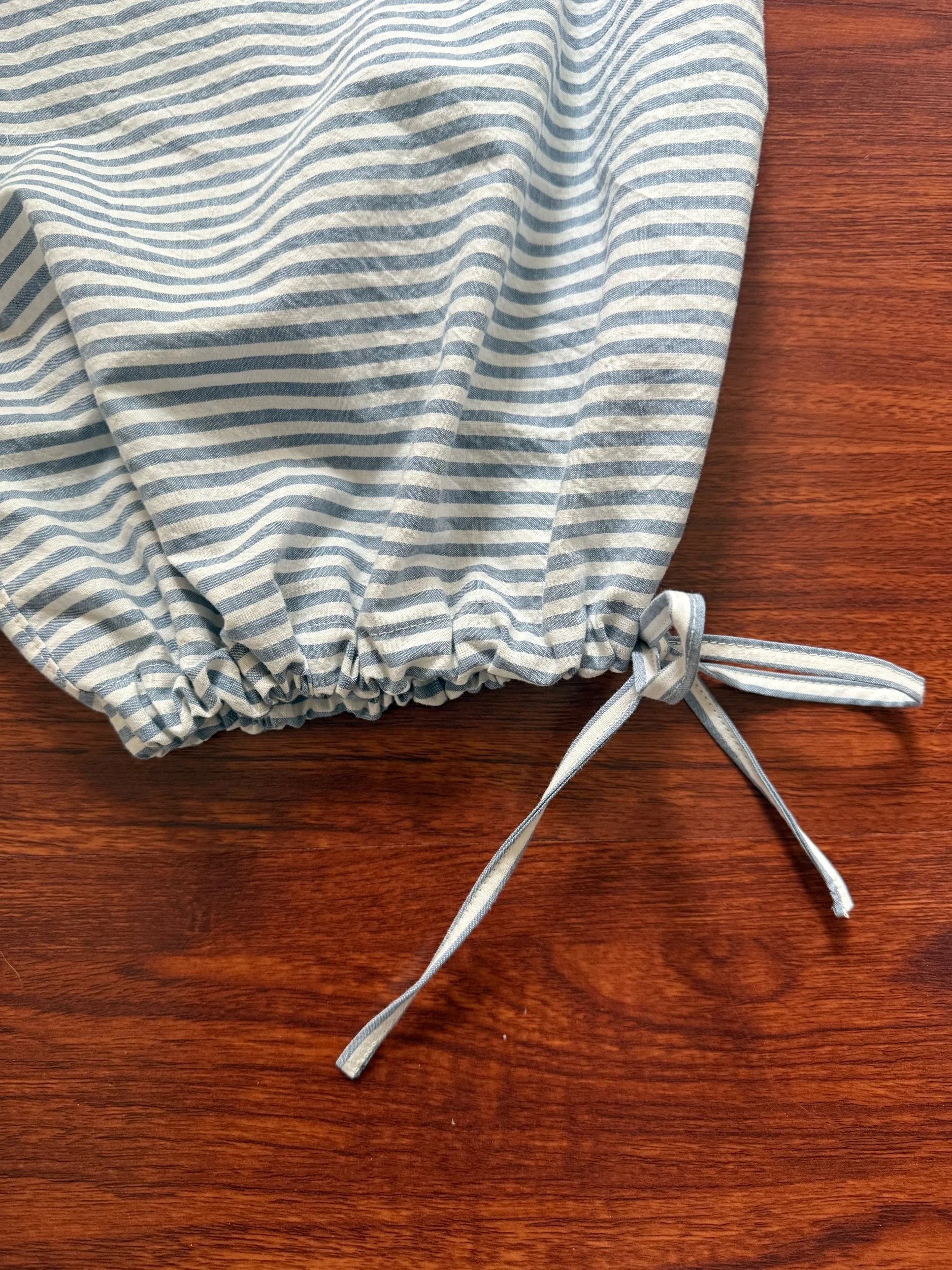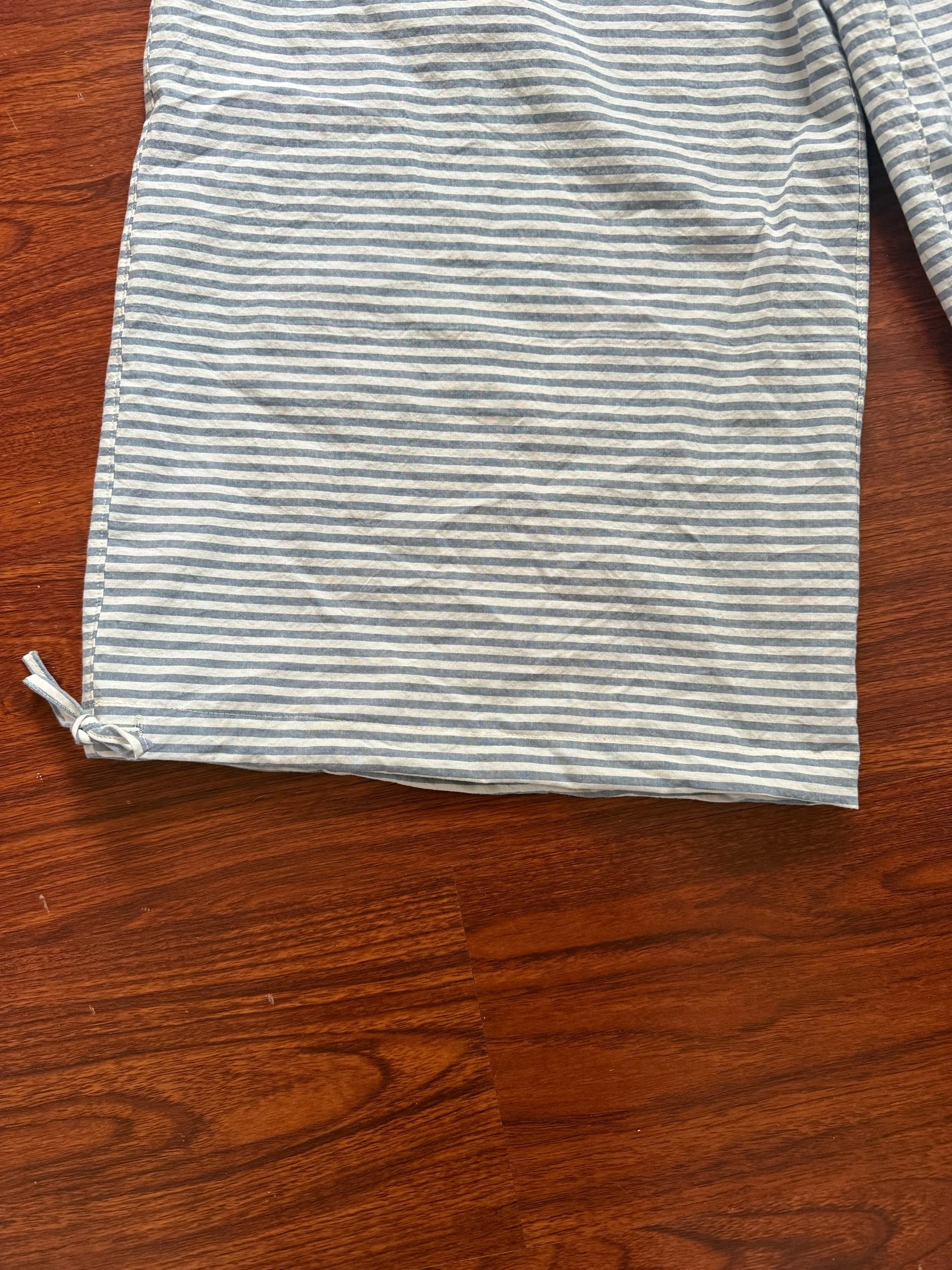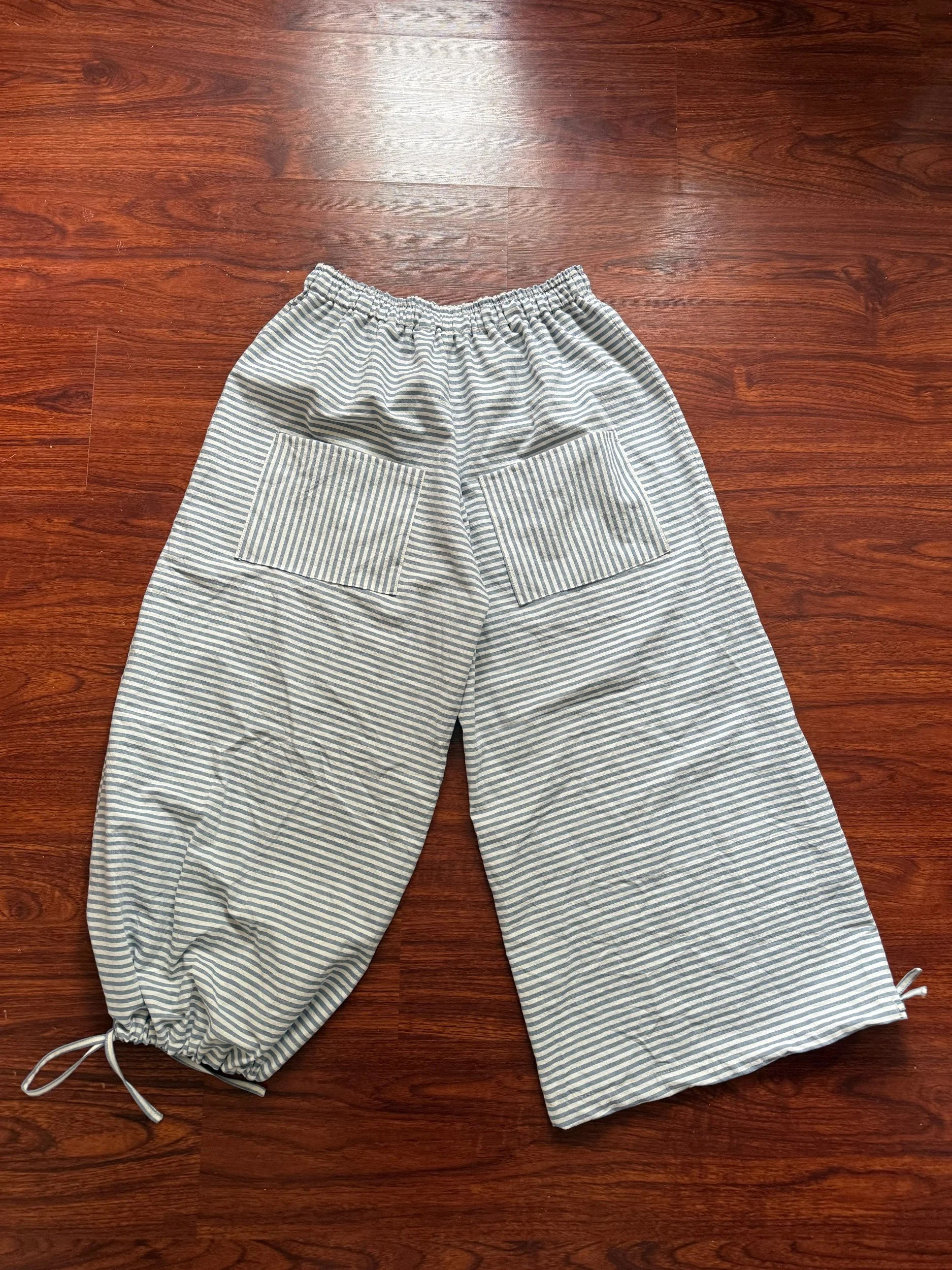 made from white and blue 100% cotton fabric with adjustable ankle ties and outside back pockets